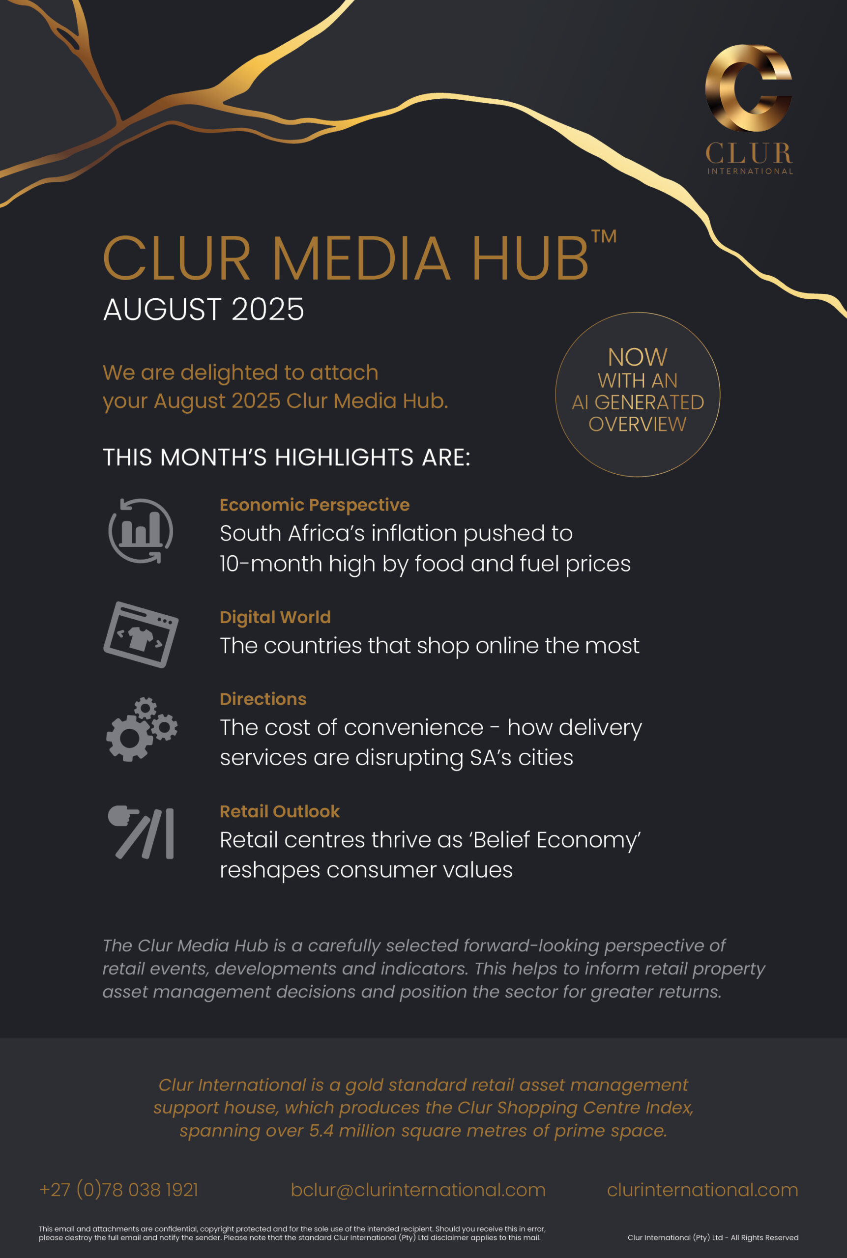 A carefully selected perspective of events, developments and indicators that help to inform retail property asset management decisions and position the sector for greater returns. This covers local, continental and global economies, commerce, industry, leisure, lifestyle and culture. It is a valuable complement to the core Clur Report of SA Retail Property, which covers over 5.4 million sqm of prime retail space, and is distributed monthly to subscribers on a complimentary basis.